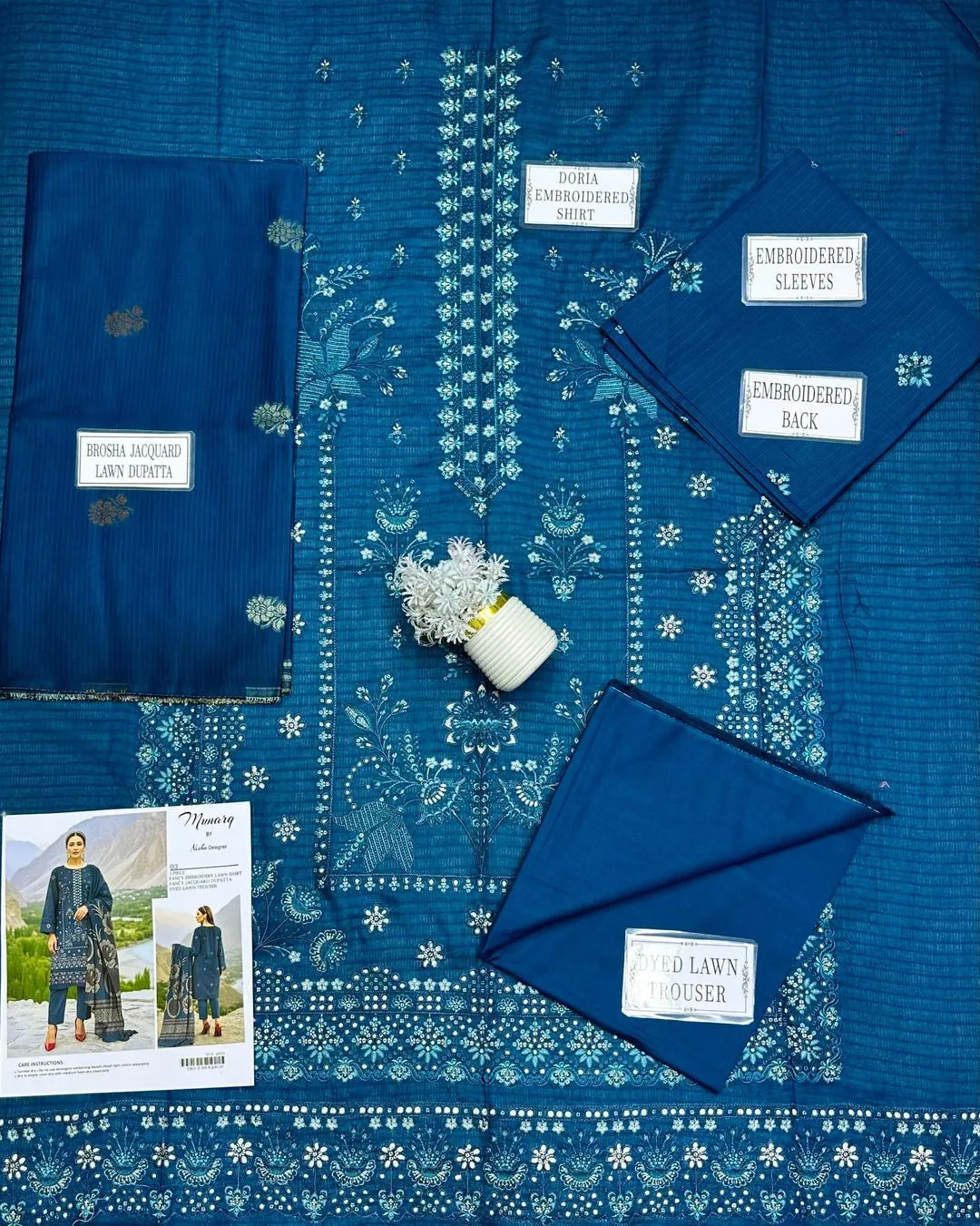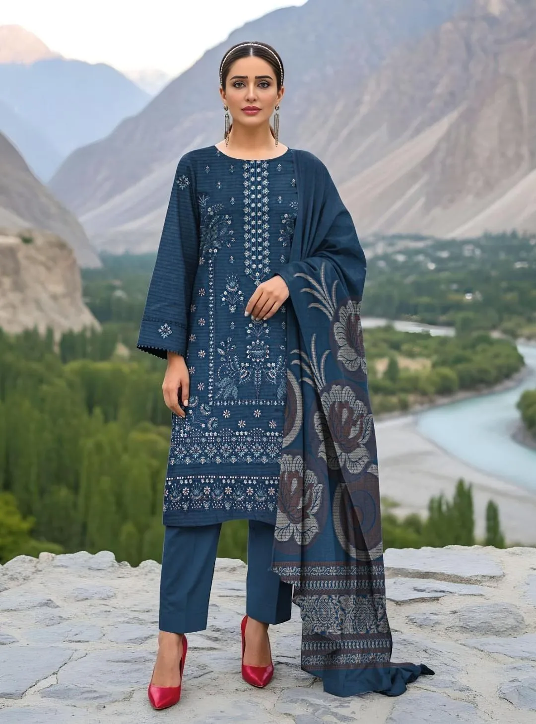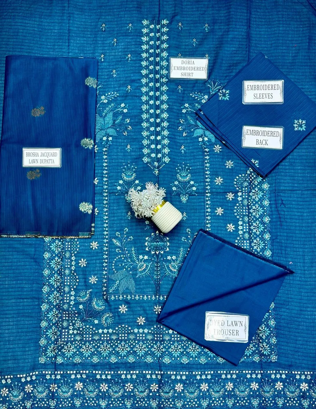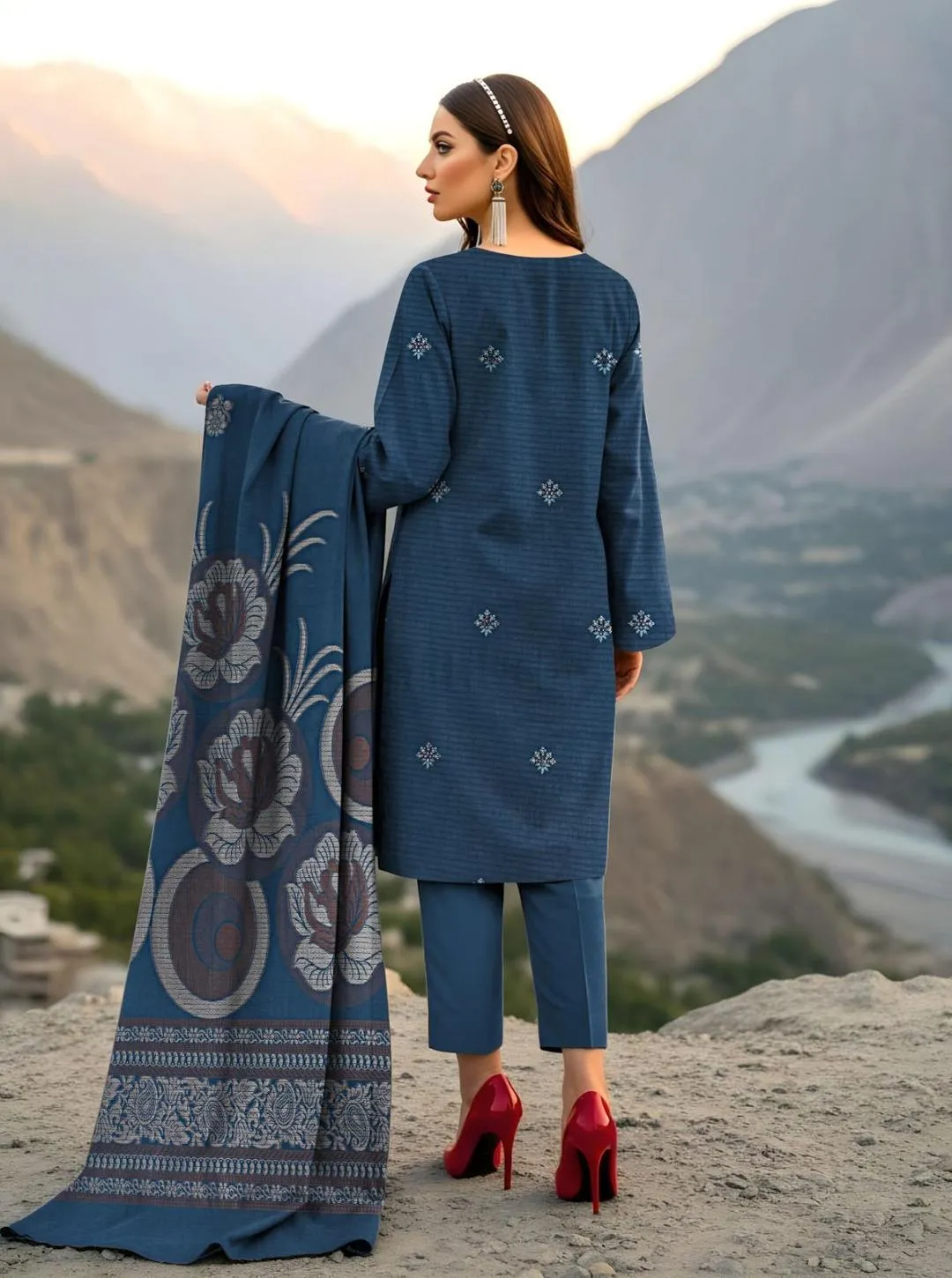 3 Pcs Women’s Embroidered Dobby Lawn Suit – Blue