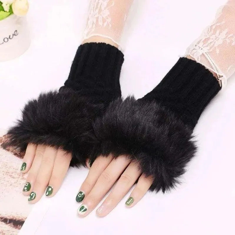 Warm Fingerless Gloves – 1 Pair Wool & Fur Fingerless Gloves Women’s Winter Accessory in Black Color
